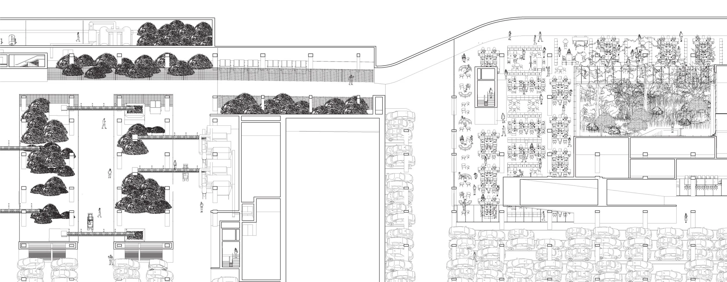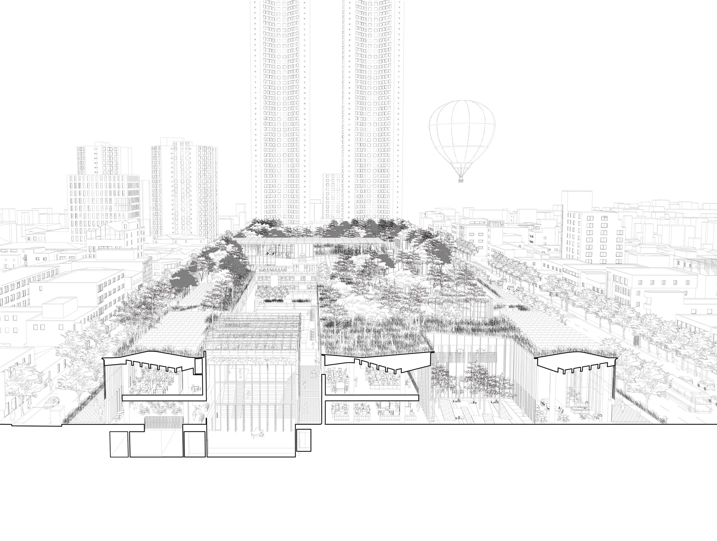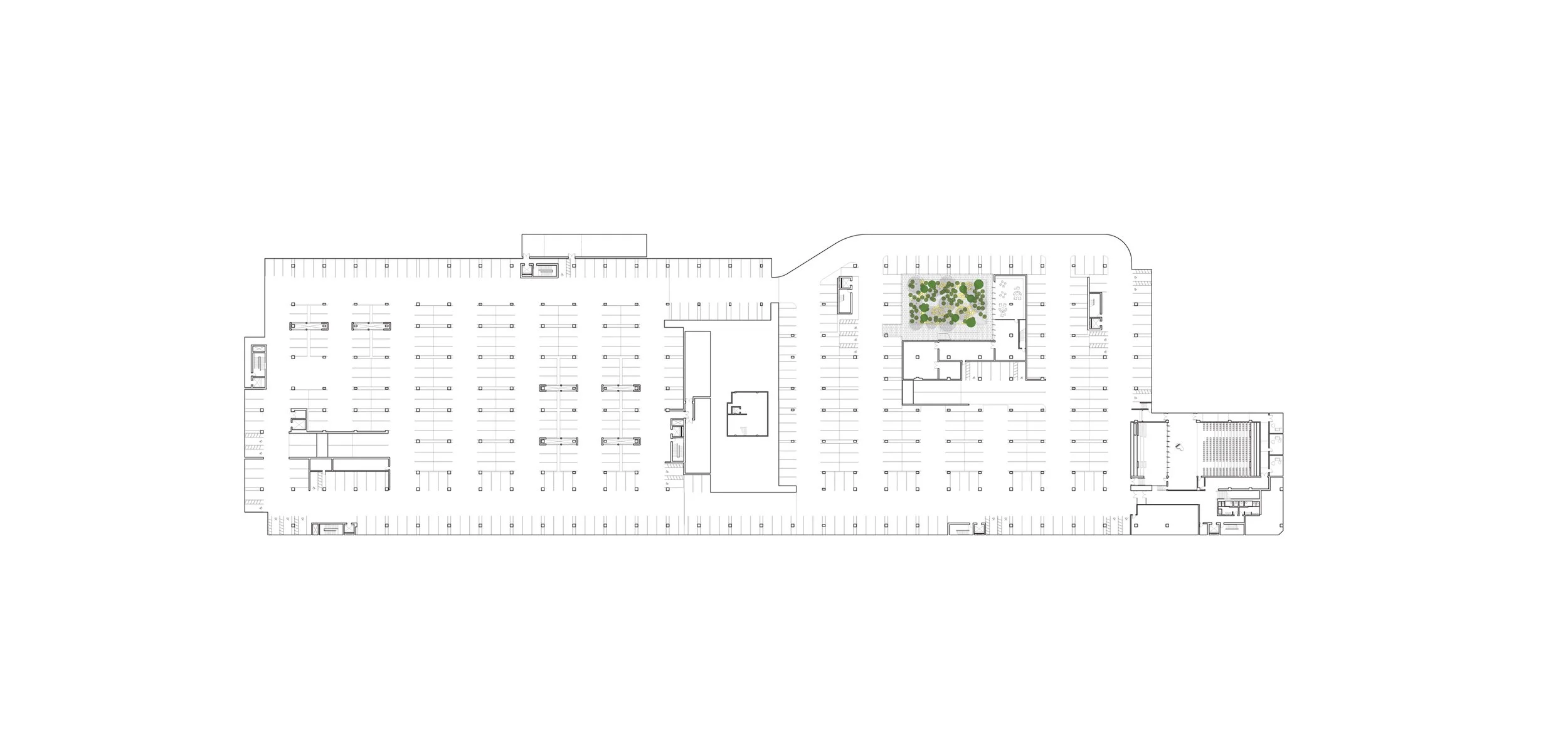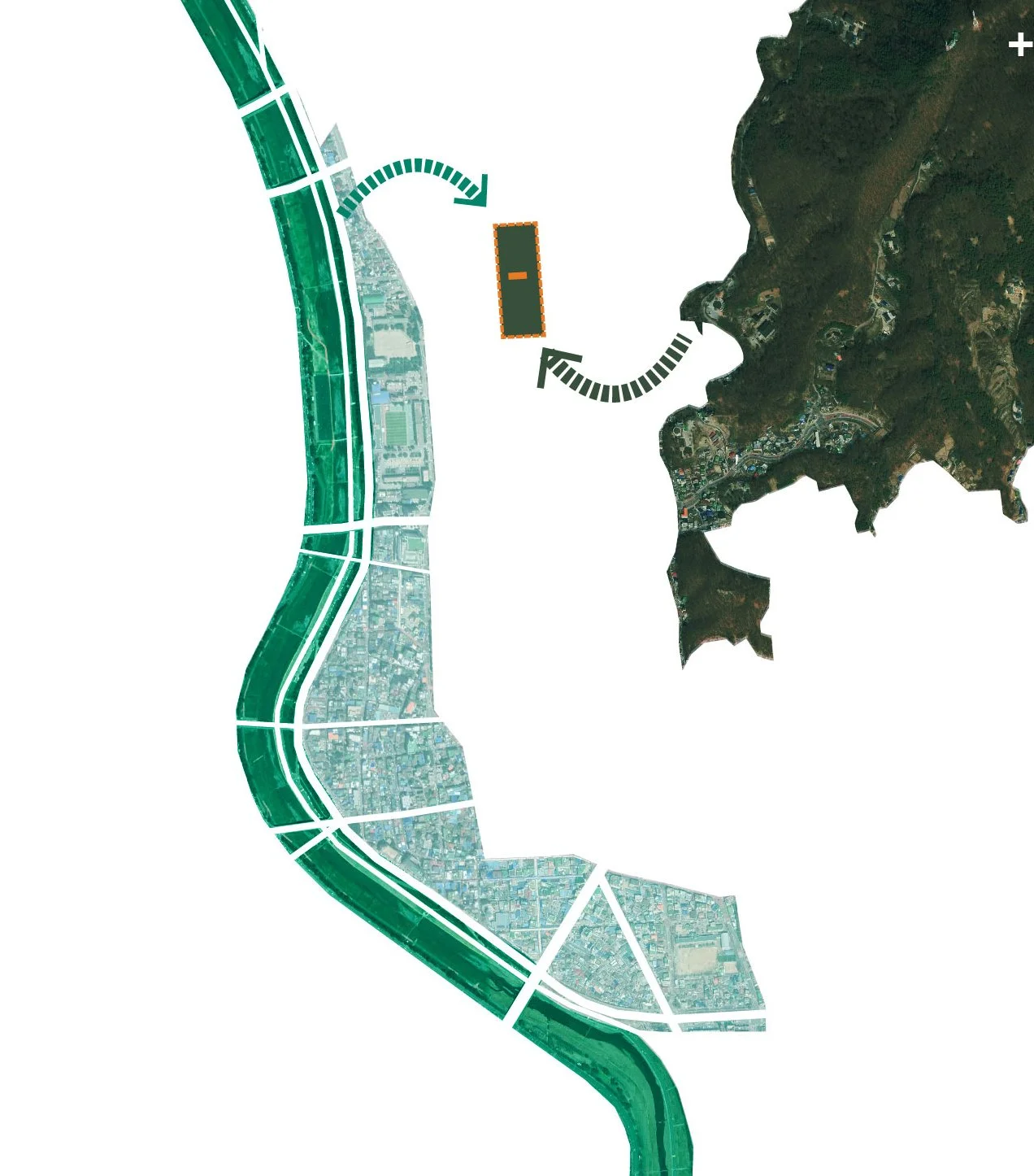 The structure of contemporary Cheongju has been established by previous settlements, which used a north-to-south axis as the primary orientation of the city. As this primary grain has been reinforced by expanded transportation infrastructure, it has effectively cut off significant access to both river and mountain. Our proposal establishes a robust and iconic rooftop landscape, a “forest island” to act as a welcoming civic destination. Leveraging the interior pedestrian streets, the project reorients the city by framing views of both mountain and river. Since Cheongju is itself positioned as a threshold between the mountainous forests and floodable rivers in the region, our project embodies this spirit of connectivity and embrace of nature that has shaped the recent history of the city.