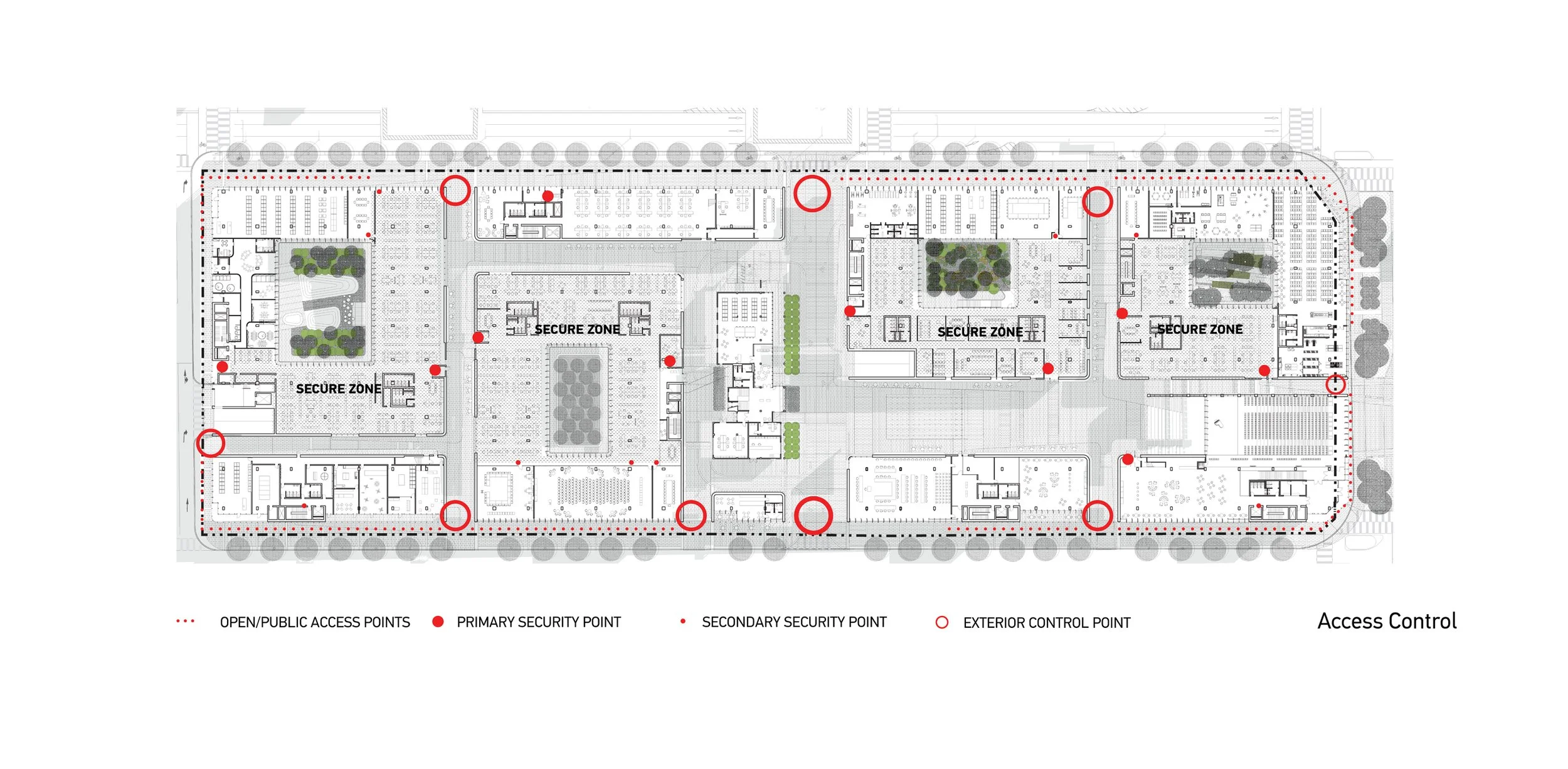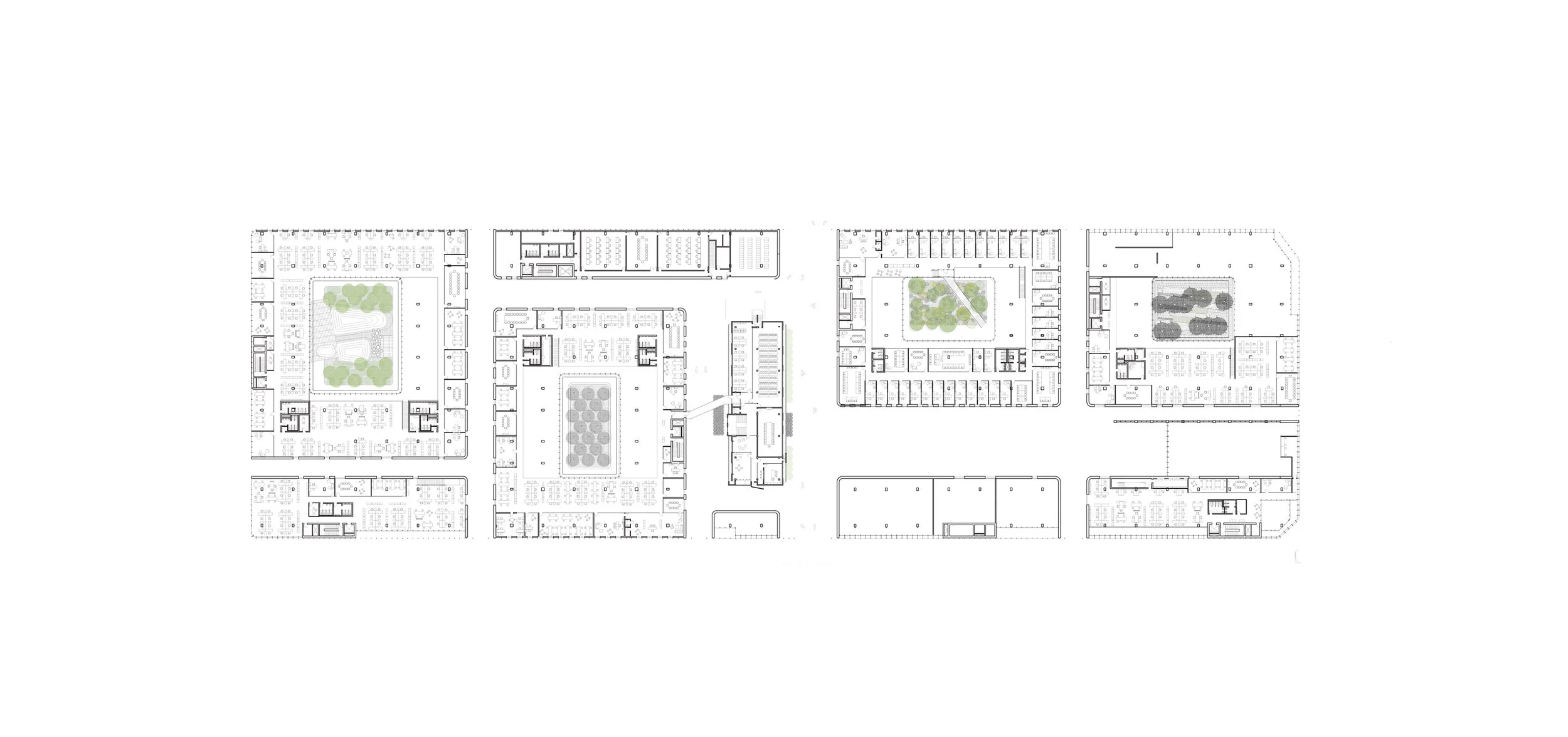 Each courtyard may be accessed across the dynamic and adaptive facades of each building, allowing the courts to fully support adjacent interior programs.