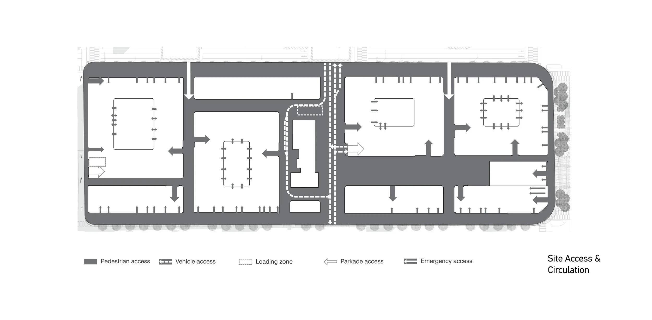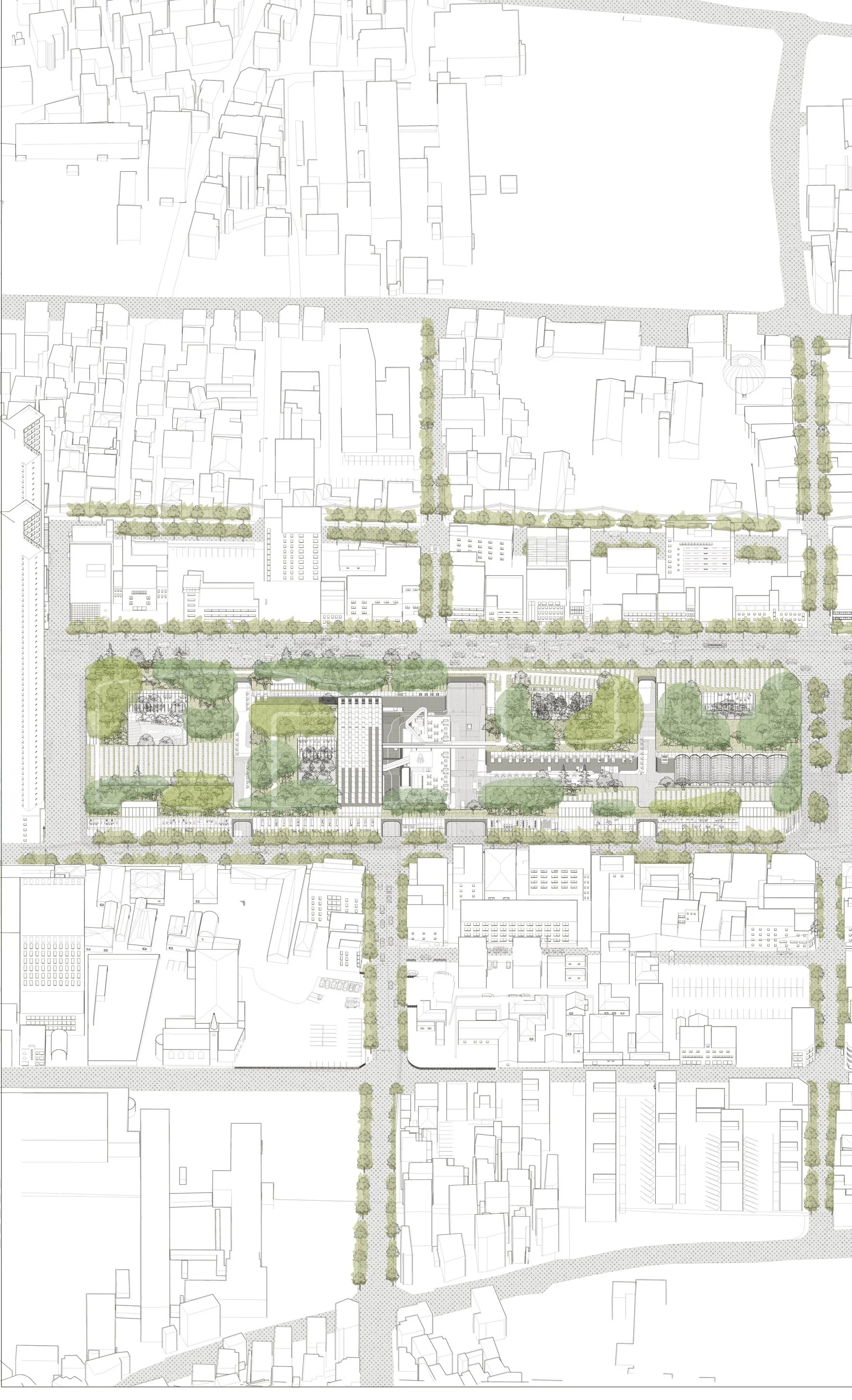 The perimeter streets leverage the Haengrang typology as not only a civic and social framework but also a spatial threshold. Further, the streets are promoted as shared surfaces, where vehicles cede to pedestrians and drivers are challenged to interpret subtle cues in paving to distinguish drive lanes. This concept extends south of the project and anticipates the extension and amplification of the pedestrian walking street adjacent to the site.
