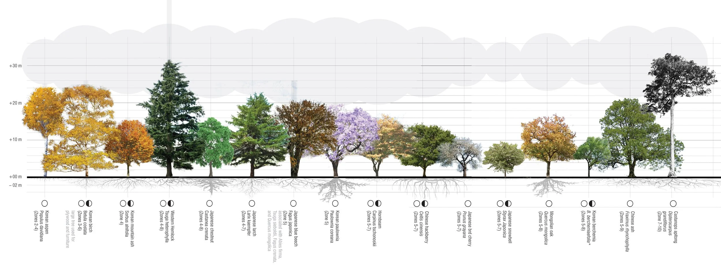 To achieve these performance and maintenance goals, the landscape design uses a rigorous layout of iconic as well as ubiquitous species in Korea, arranging the planted layers in alternating grids. This achieves a remarkable informality and sense of wilderness, while promoting clear and minimal management and maintenance.