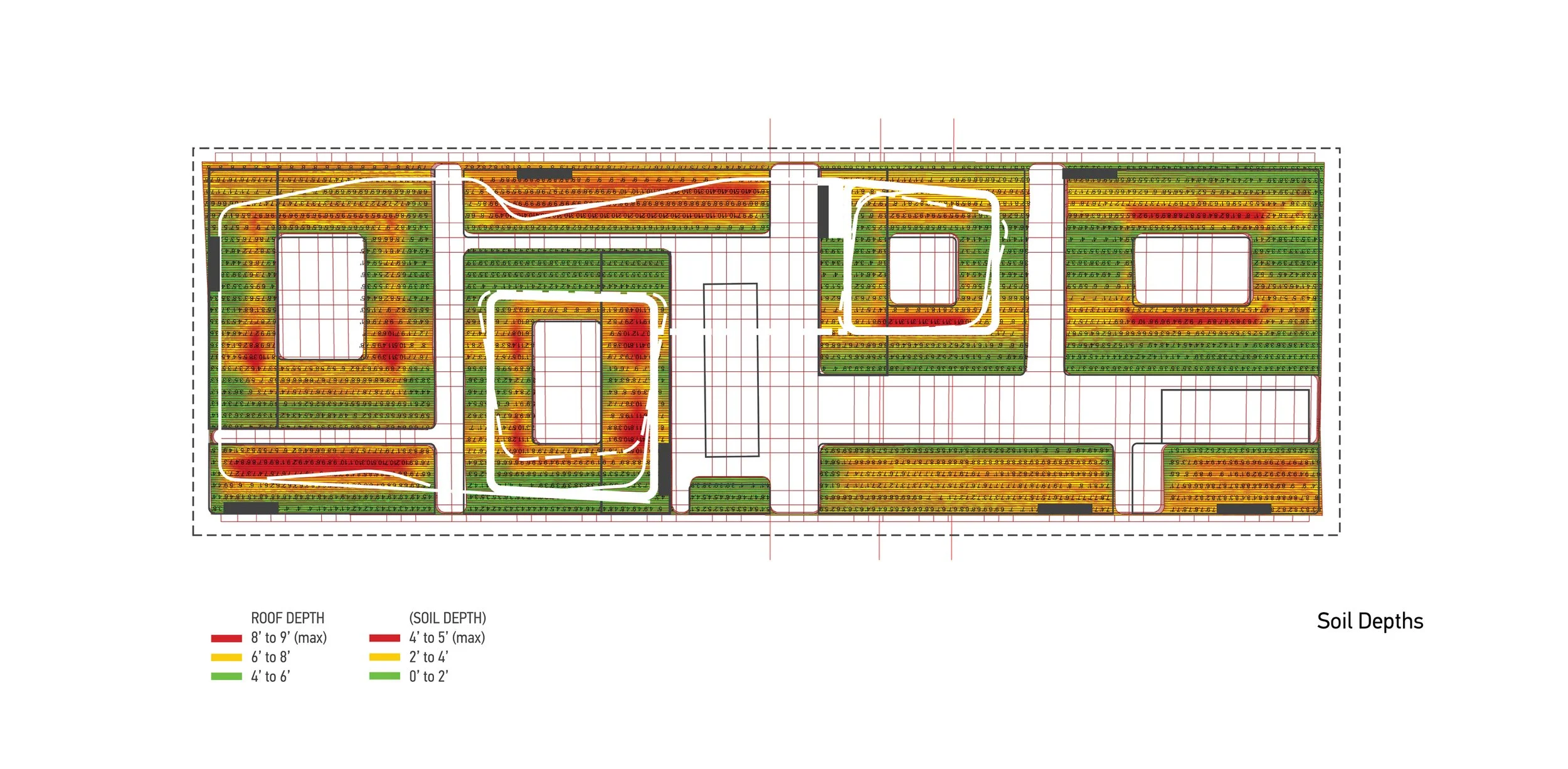 The living roof is thick with opportunity and optimism for the future. As a highly constructed ground, the roof garden is intensely and intentionally not naturalistic. The form is shaped by attention to soil as foundation for robust ecological futures. The several “pleats” evoke the nearby forested mountains and floodplain rivers. This hyper-natural emphasis on microtopography and microclimate helps promote change, difference, and horticultural experimentation.