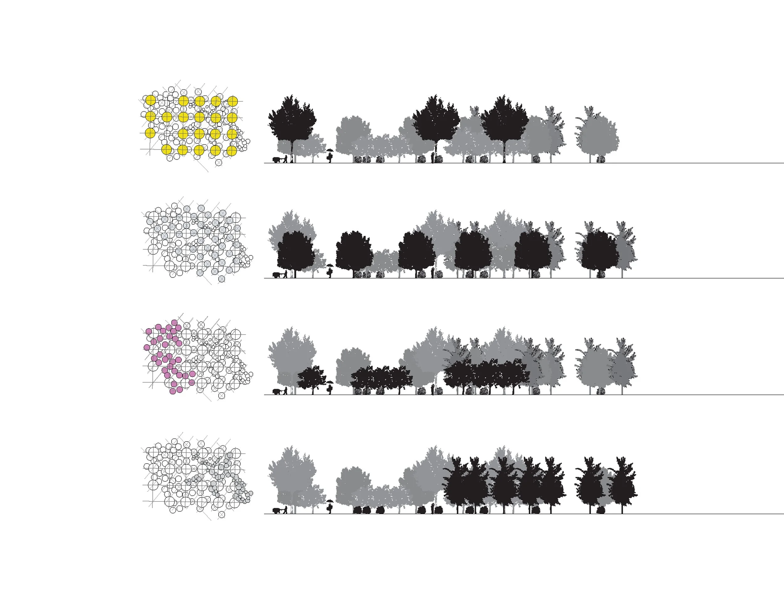 The growth of sustainable cities depends on improving the integration of ecological stewardship into city planning efforts. This project leverages principles of landscape ecology to generate a new civic campus. Typical urban forestry and ecological conservation approaches in cities focus on remnant vegetation and manage forest reserves outside of the urban systems. Instead, we propose to manage a new forest within the city. Typical public space approaches focus on program and treat landscape as a thin surface for recreation or resource for exploitation and consumption. Instead, we propose a thick and diverse landscape that challenges expectations for a civic campus. Planting is controlled but not overly maintained, and combines with the roof form, which can be optimized to provide social, ecological, and infrastructural advantages. The planting alternates between forest and meadow, creating moments of prospect and refuge along a loop path that offers wide promenades and also intimate moments of reflection and discovery. Folded topographic “pleats” enhance this range of experiences, and also promote microclimate cooling and utility benefits for the building. The thermal mass of deep soils, calibrated for economical alignment with the structural system, becomes a productive ground for the forest island ecology.