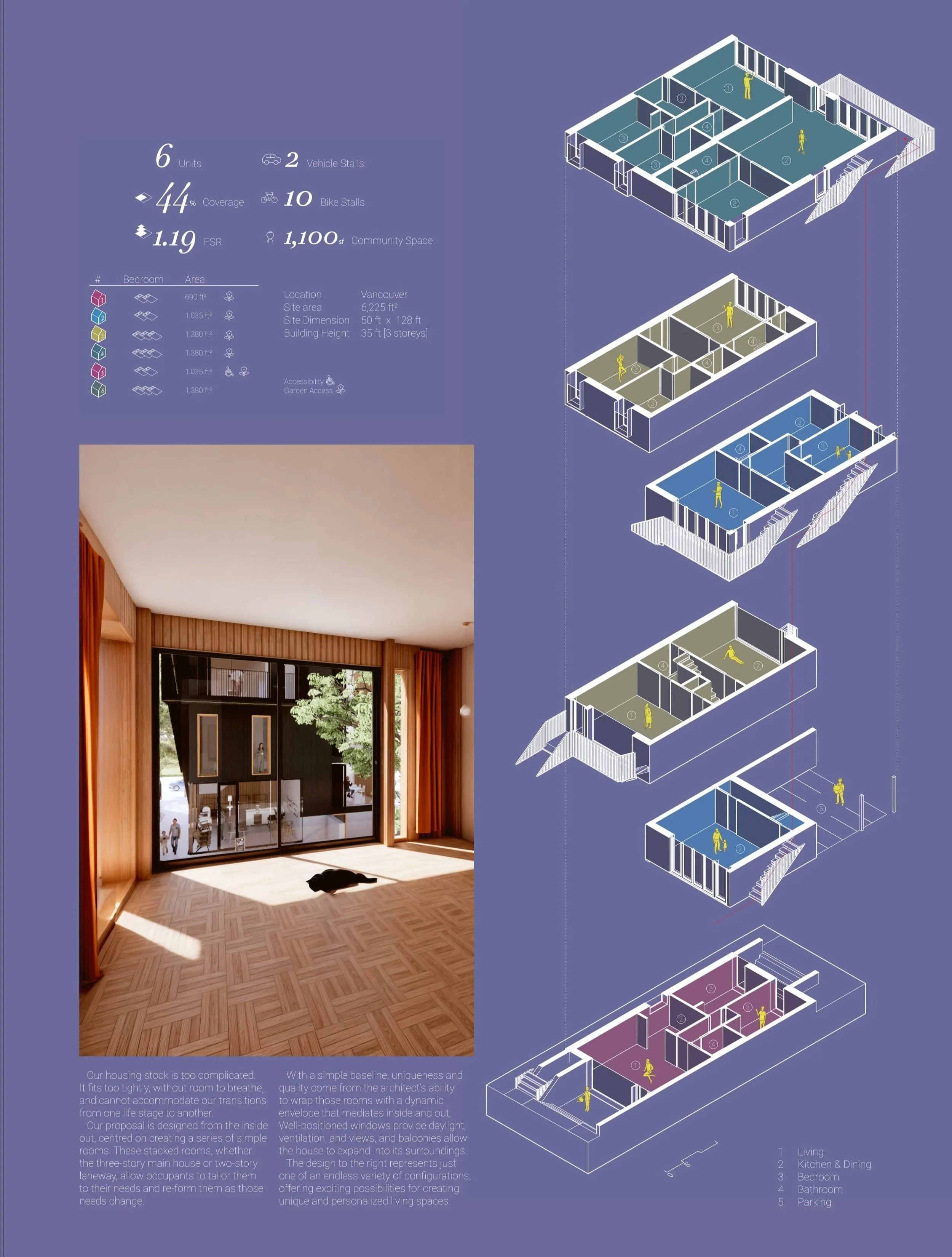 Cities across the province are starting to receive building permit applications fitted to their new zoning bylaws. In this time of new possibilities for architecture and design, the Field Collective asked its members to dive into the new rules to discover what unique opportunities for living together they make possible. Each architectural practice has chosen a municipality and proposed a design that conforms to the new SSMUH rules in that city. Among the design responses you’ll find a wide range of homes suited to all kinds of residents and neighbourhood conditions.