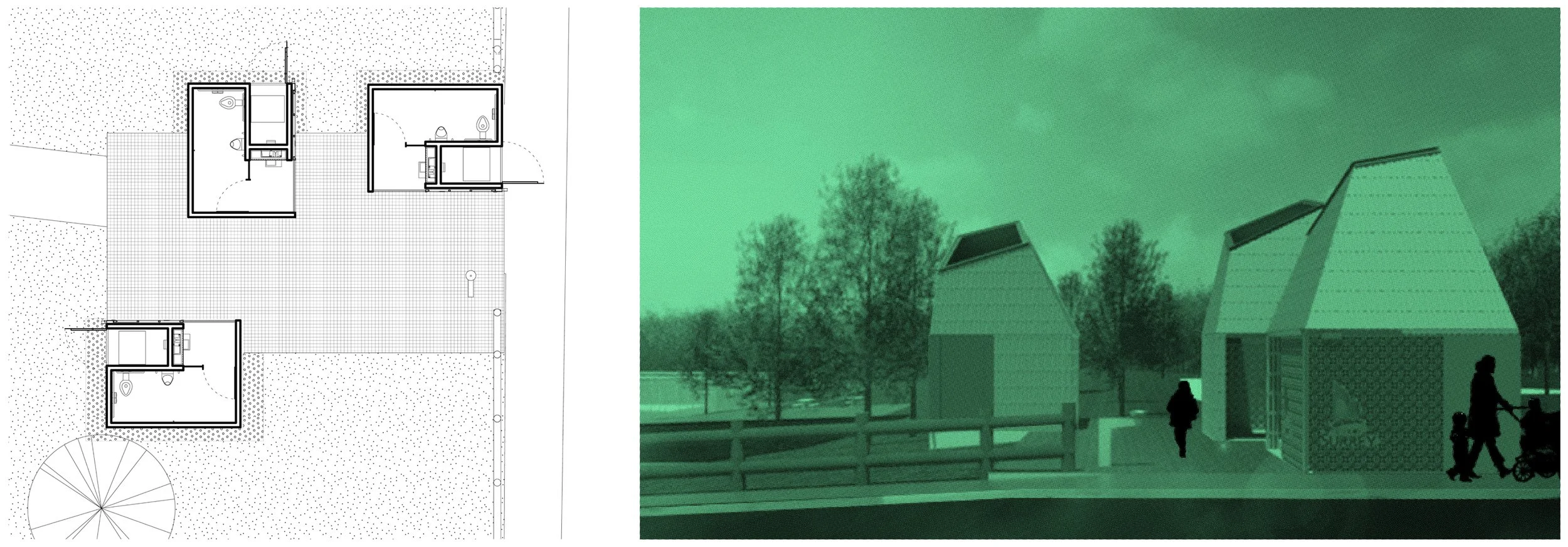 06 - DOUBLE UNITS IN VILLAGE: A second arrangement of the units would be a village arrangement around a central path or space. Again, alternating roof forms would provide variation.