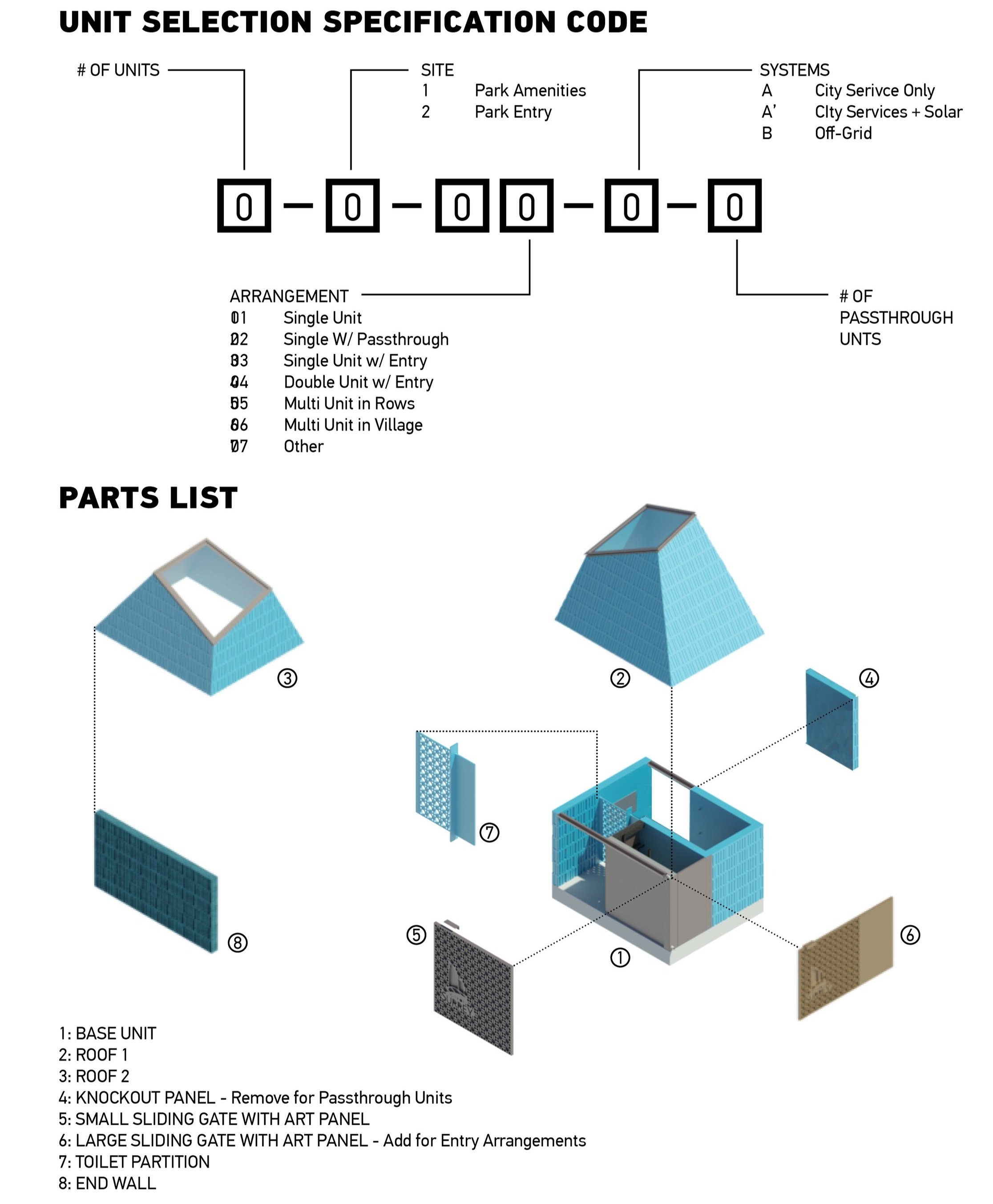 FLEXIBILITY: The unit is designed to accommodate a variety of different installations and arrangements for the different parks in Surrey. Within the unit, it is possible to locate the toilet partition in several areas and there are two options for systems/services. There is also flexibility in the arrangement of the units, with 6 types shown.