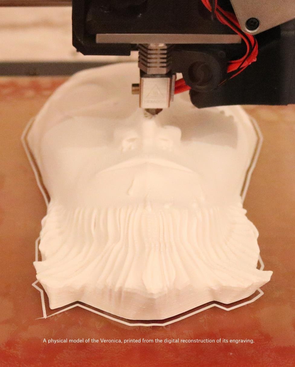 Through a succession of material experiments, the Veronica is mechanically reproduced. Building from a 3D digital print, the processes of molding, casting, and dying generate a new series of reproductions through the direct imprint of one surface onto another.
